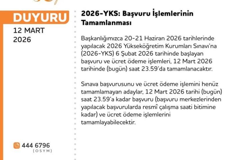 MEB tarafından 20-21 Haziran tarihlerinde yapılacak 2026 Yükseköğretim Kurumları Sınavı’na (2026-YKS) 6 Şubat tarihinde başlayan başvuru ve ücret ödeme işlemleri, bugün saat 23.59’da tamamlanacak.
