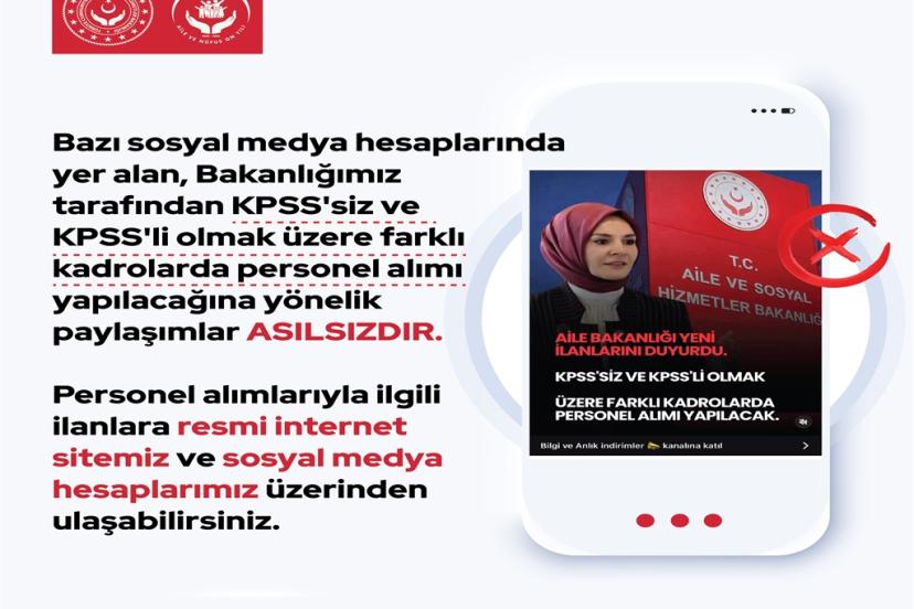 Aile ve Sosyal Hizmetler Bakanlığı sanal medya hesabından yapılan paylaşımda, “Bazı sosyal medya hesaplarında yer alan, Bakanlığımız tarafından KPSS'siz ve KPSS'li olmak üzere farklı kadrolarda personel alımı yapılacağına yönelik paylaşımlar asılsızdır. Personel alımlarıyla ilgili ilanlara resmi internet sitemiz ve sosyal medya hesaplarımız üzerinden ulaşabilirsiniz” ifadeleri kullanıldı.