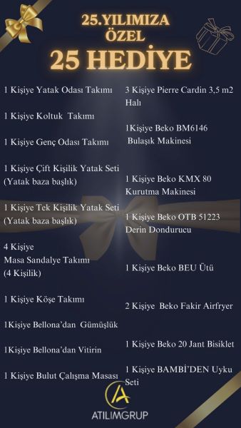 Atılım Grup, 25. yılına özel olarak düzenlediği kampanyada, toplamda 25 büyük hediyeyi çekilişle dağıtacak. Koltuk takımlarından beyaz eşyaya, genç odası takımlarından ünlü markalara ait halılara kadar onlarca değerli ürün, yeni sahiplerini bekliyor.