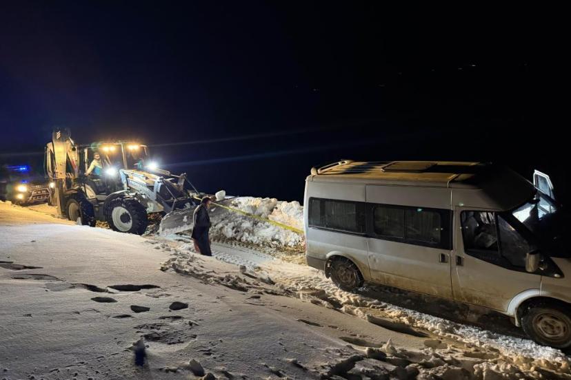 Van'ın Başkale ilçesinde kar yağışı ve tipinin etkisiyle yoldan çıkan minibüs kar birikintisine saplandı.