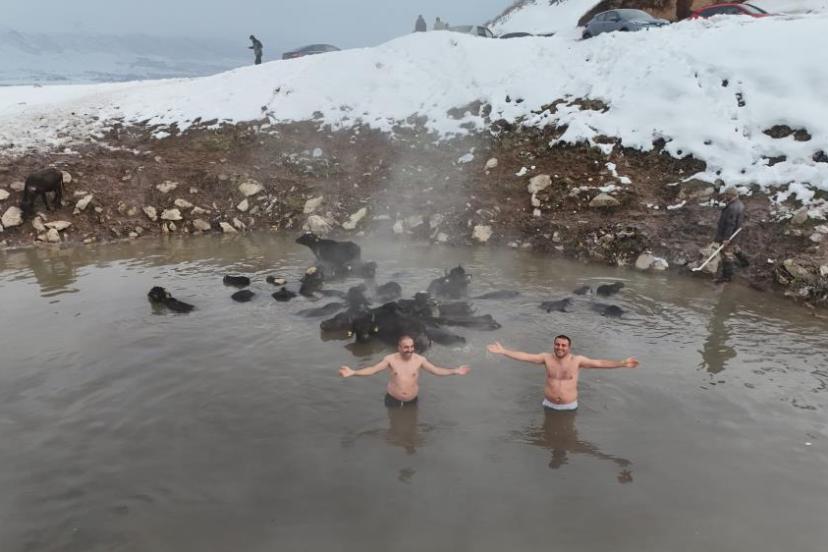 Bitlis'in Güroymak ilçesine bağlı Budaklı köyünde bulan doğal kaplıcalar, havaların eksi derecelerde seyrettiği kış aylarında hem insanlara hem de bölgedeki hayvanlara keyifli anlar yaşatıyor.