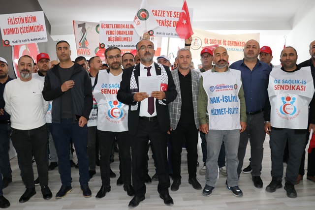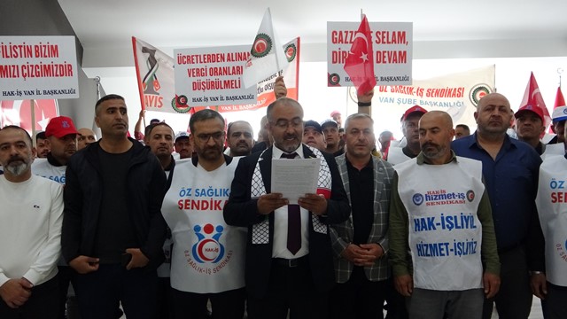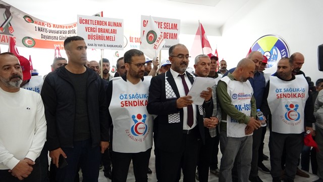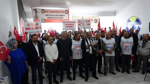 Açıklamalarında Filistin halkı için taleplerini de dile getiren Akdeniz, “1 Mayıs Uluslararası Birlik, Mücadele ve Dayanışma Günü’nde Hak-İş olarak, Filistin topraklarında akan kanın ve katliamların durdurulması, Gazze’de onurları için, Özgür Filistin için, canları pahasına mücadele eden Filistinli kardeşlerimizin insan haklarının sağlanması için tüm dünyayı ve tüm dünya emekçilerini mücadele etmeye ve birlik olmaya davet ediyoruz. Siyonist İsrail Devleti tarafından esir alınan bütün Filistinli işçilerin serbest bırakılmasını talep ediyoruz. Başkenti Kudüs olan özgür ve bağımsız Filistin devleti kuruluncaya kadar mücadele edeceğimizi bir kez daha ilan ediyoruz. Filistin’de barış ve huzur ortamının sağlanmasını, Mescid-i Aksaya yönelik yapılan, en temel özgürlük olan ibadet özgürlüğünü hedef alan bütün kısıtlamaların ivedilikle kaldırılmasını talep ediyoruz. Filistin halkına, gıda, ilaç, su, gibi temel yaşam gereçlerinin güvenli ve insani koşullar altında ivedilikle ulaştırılmasını talep ediyoruz. Hak-İş, mazlum ve mağdur coğrafyalarda huzur ve barışın tesisi için sendikalarımız ve işçilerimiz ile omuz omuza dayanışmasını devam ettirecektir. ‘Filistin İçin Haydi Hak-iş’ diyoruz ve tüm teşkilatımıza Van’dan birlik, dayanışma ve yardımlaşma çağrısında bulunuyoruz” diye konuştu.