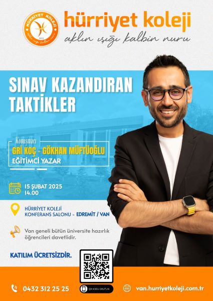 Van’da yıllardır eğitimde büyük katkılar sunan Hürriyet Koleji, Van geneli YKS ye hazırlık öğrencileri için ‘Sınav Kazandıran Taktikler’ semineri düzenleyecek.