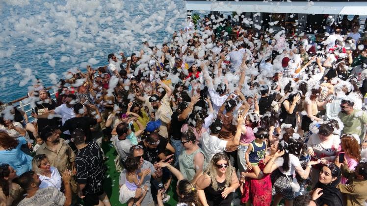 Okulların tatil olması nedeniyle Van'a gelen İranlı turistler, tekne ile açıldıkları Van Gölü'nde köpük partisi yaparak eğleniyor.