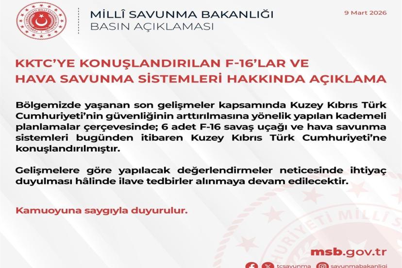 MİLLİ Savunma Bakanlığı (MSB), Kuzey Kıbrıs Türk Cumhuriyeti’nin (KKTC) güvenliğinin artırılmasına yönelik yapılan kademeli planlamalar çerçevesinde; 6 adet F-16 savaş uçağı ve hava savunma sistemlerinin bugünden itibaren KKTC'ye konuşlandırıldığını açıkladı.