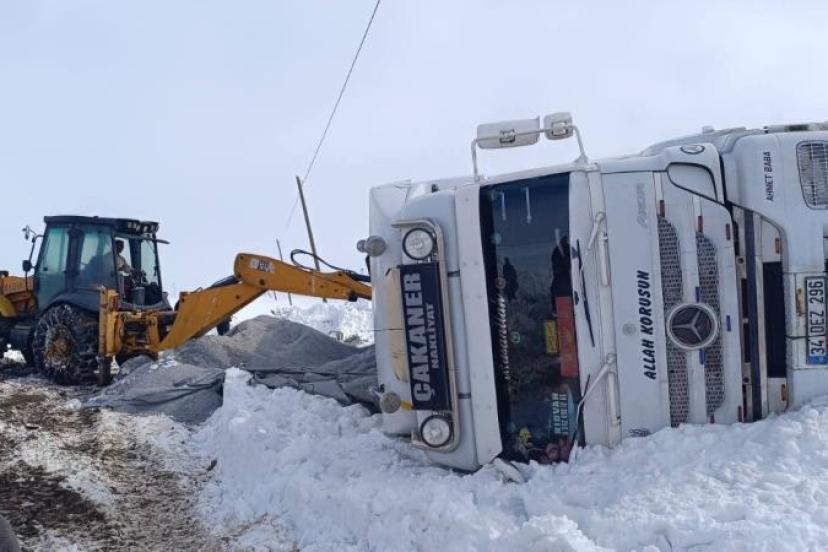Van’ın Muradiye ilçesinde gizli buzlanmadan dolayı kontrolden çıkan tır devrildi.