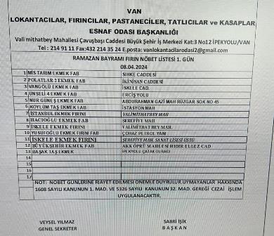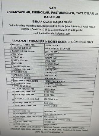 Van Lokantacılar Fırıncılar Pastaneciler Tatlıcılar ve Kasaplar Esnaf Odası, bayramın ilk 3 gününde çalışacak olan ekmek fırınlarının tam listesini paylaştı. Yapılan bilgilendirmeye göre Ramazan Bayramı’nın birinci günü Mis Tarım Ekmek Fabrikası, Polatlar 2 Ekmek Fabrikası, Van Gölü Fabrikası, Ünseli 4 Ekmek Fabrikası, Nur Güneş Ekmek Fabrikası, Köylüm Taş Ekmek Fabrikası, İstanbul Ekmek Fabrikası, Hacıoğlu Ekmek Fabrikası, İskele Ekmek Fırını, Yusufoğlu Ekmek Fırını Fabrikası, Büyükşehir Ekmek Fabrikası, Başak Taş Ekmek fırını açık olacak.