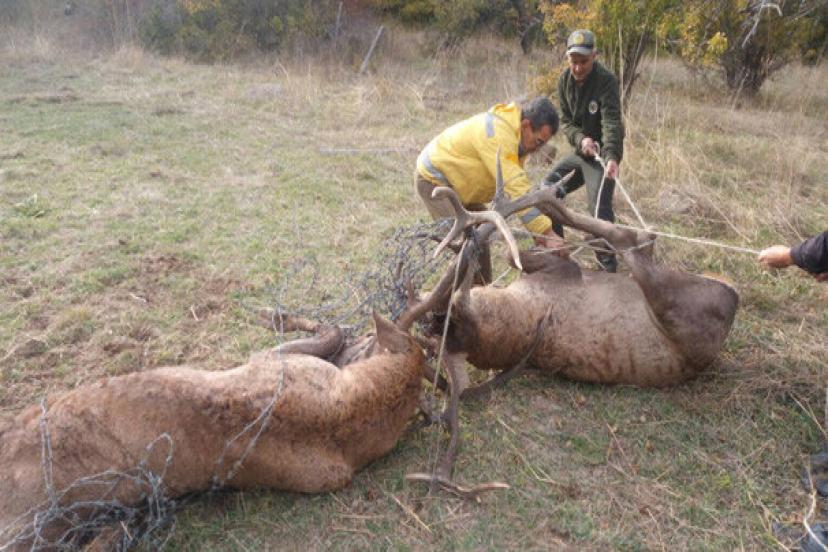 Çiftleşme kavgasında tellere takılan 2 geyikten biri telef oldu.