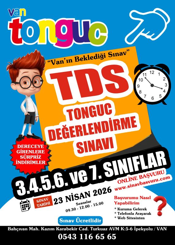 Tonguc Van Kurs; 3, 4, 5, 6 ve 7. sınıf öğrencilerine yönelik Türkiye geneli değerlendirme sınavı düzenliyor.