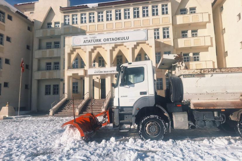 Tuşba Belediyesi Fen İşleri Müdürlüğü ekipleri, artan buzlanma riskine karşı ilçe genelindeki okul yolları ve bahçelerinde kar temizleme ve tuzlama çalışmalarını yoğunlaştırdı.