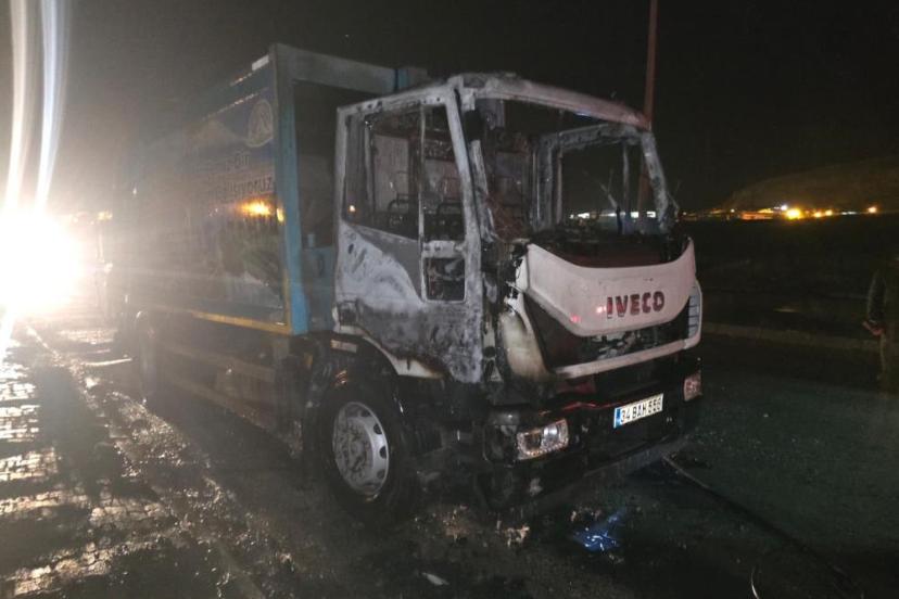 Van'ın Tuşba ilçesine seyir halindeki belediyeye ait çöp kamyonu seyir halindeyken alev alev yandı.