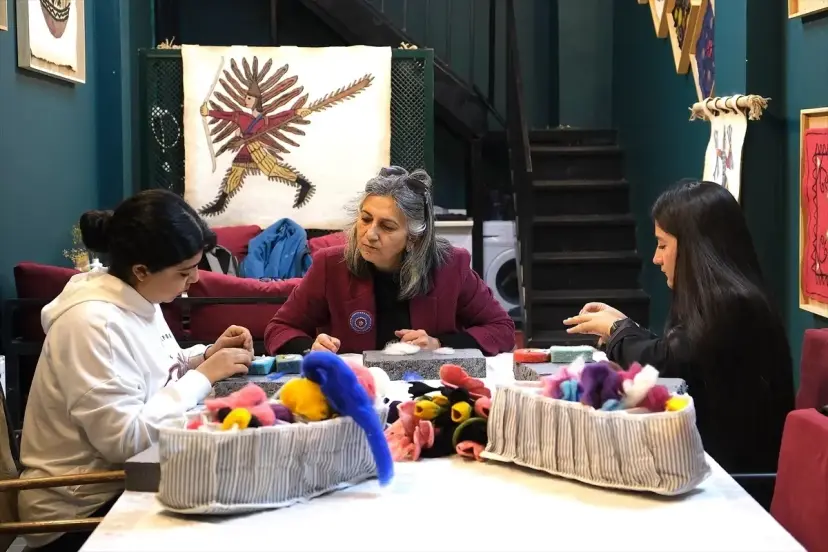 Necmiye Tekin, keçe sanatını genç nesillere aktarmak için atölyede eğitim veriyor.
