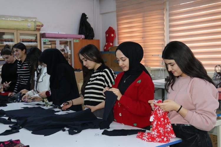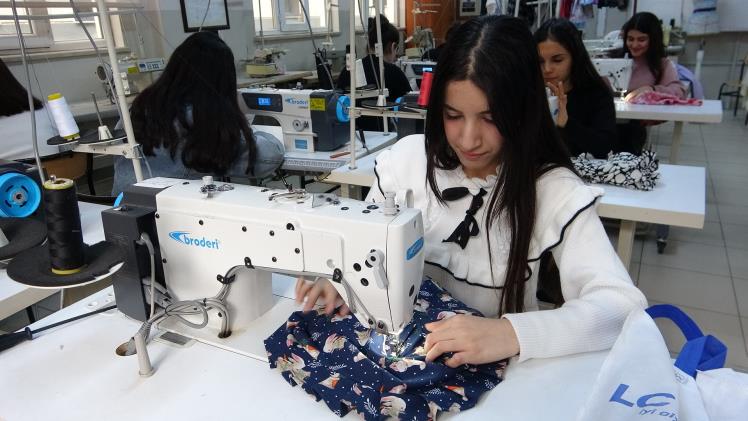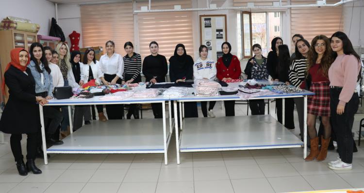 Van’da Vestel Kız Mesleki ve Teknik Anadolu Lisesi Moda Tasarım Bölümü öğrencileri, ihtiyaç sahipleri için elbiseye dikiyor.